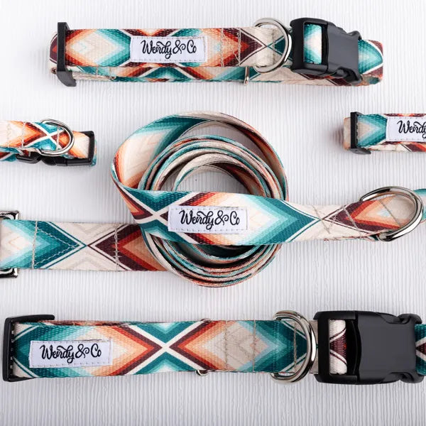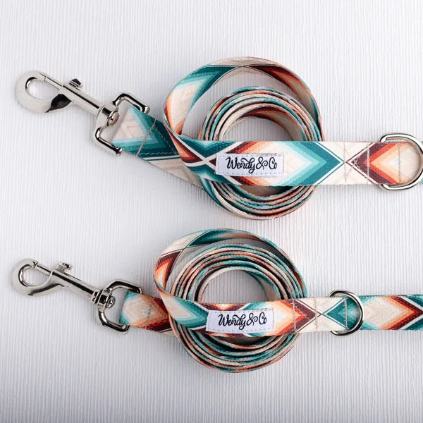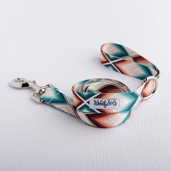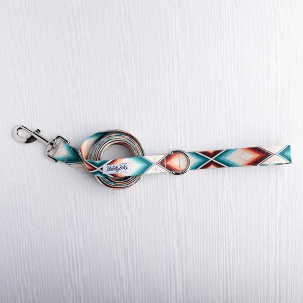 Complete the look with our Cheyanne Dog Leash, designed to perfectly pair with the Cheyanne Collar. This handmade leash features a tan-beige background accented by rust and teal in a bold geometric pattern, inspired by Southwestern and serape-style designs with a modern boho twist. Both durable and stylish.