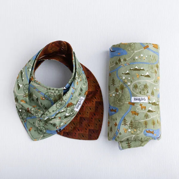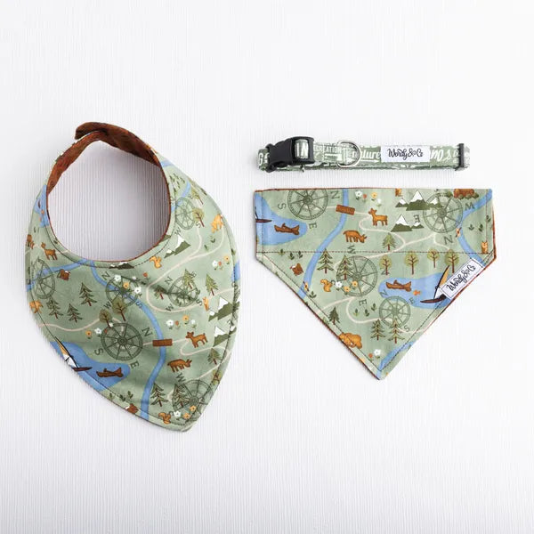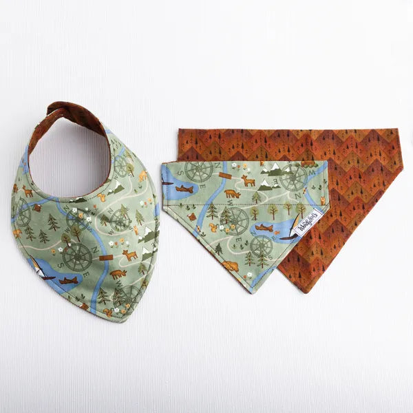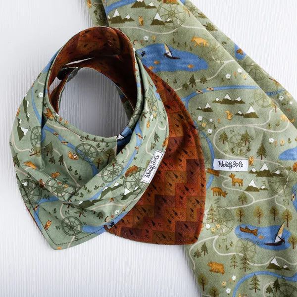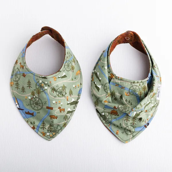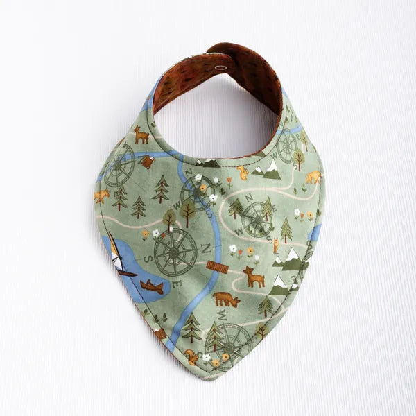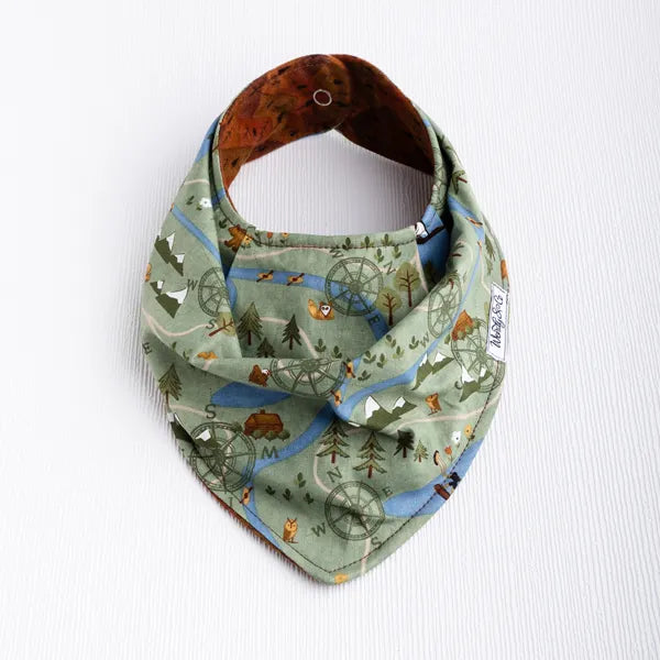 Bring the spirit of the outdoors to mealtime with our Forest Adventure baby bib. One side features a green map print with deer, bears, cabins, compasses, and mountain peaks, while the reverse is soft rust flannel patterned with geometric mountains and trees. Handmade for comfort and durability, this bib keeps little ones stylish and protected. Coordinates with our Forest Adventure dog bandana, collar, and leash—plus a matching blanket—for sweet family photos and gifts that celebrate adventure.