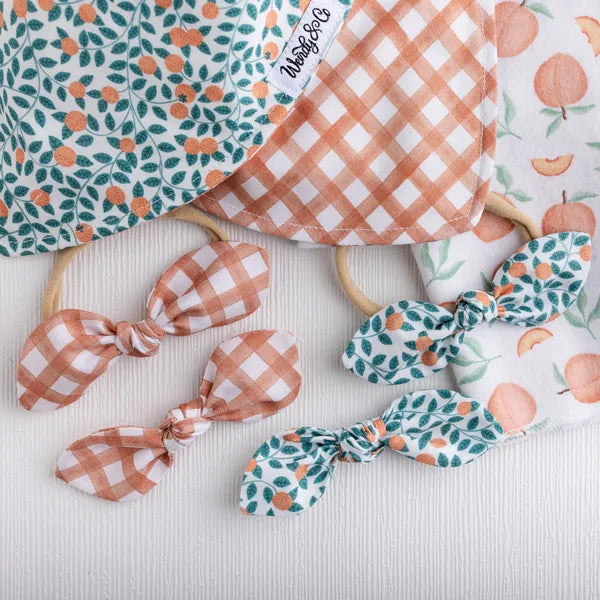 Bring orchard sweetness to mealtime with our Orchard Days baby bib. Handmade in a cheerful fruit print, it’s both stylish and functional. Coordinates with the Orchard Days baby bow and blanket, and even matches your pup’s accessories for family photos full of harvest charm.