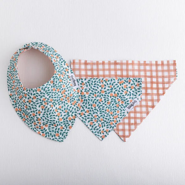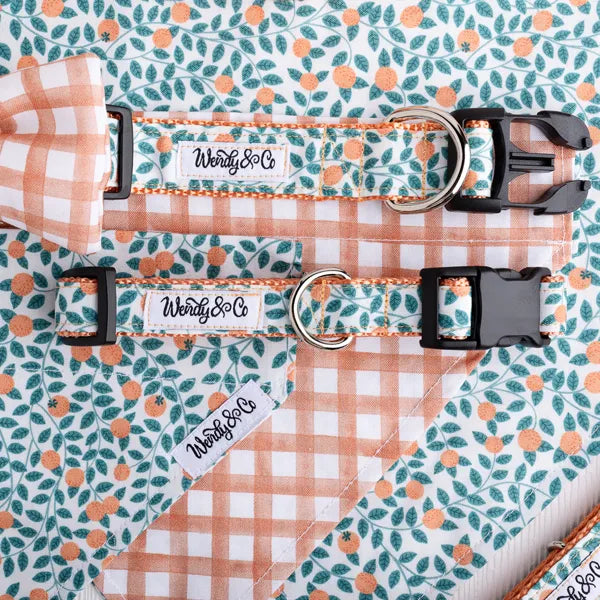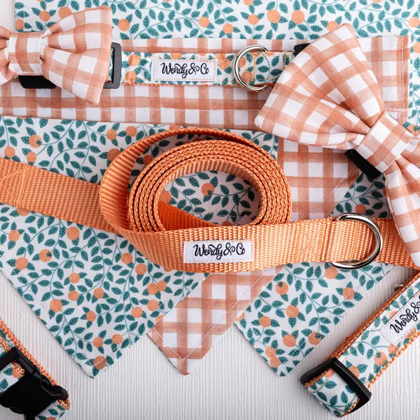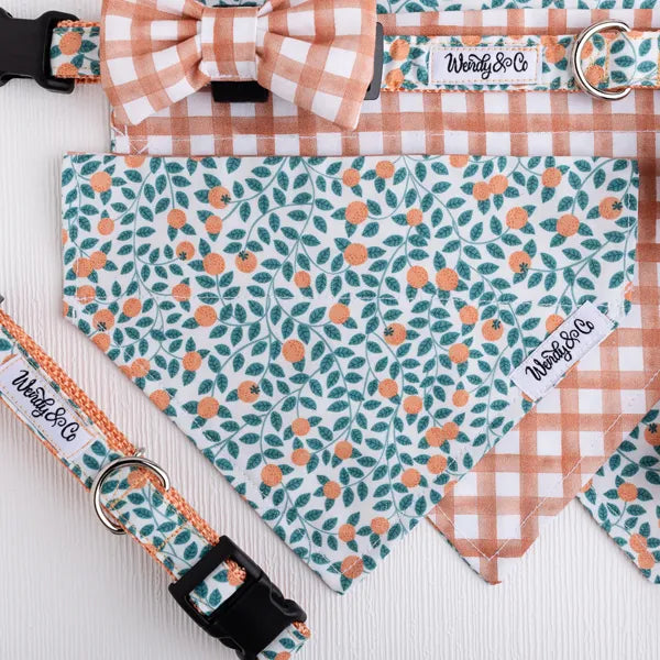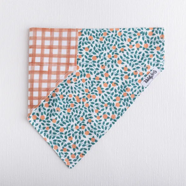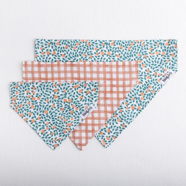 Bring fresh-picked style to your pup with our Orchard Days dog bandana. The cheerful fruit orchard print adds a touch of harvest charm, perfect for autumn walks or seasonal photos. Reversible design gives you two looks in one. Coordinates with the Orchard Days collar, bow tie, Peach Leash, and matching baby accessories for picture-perfect moments.