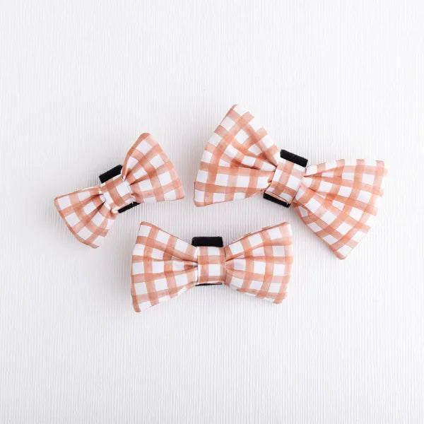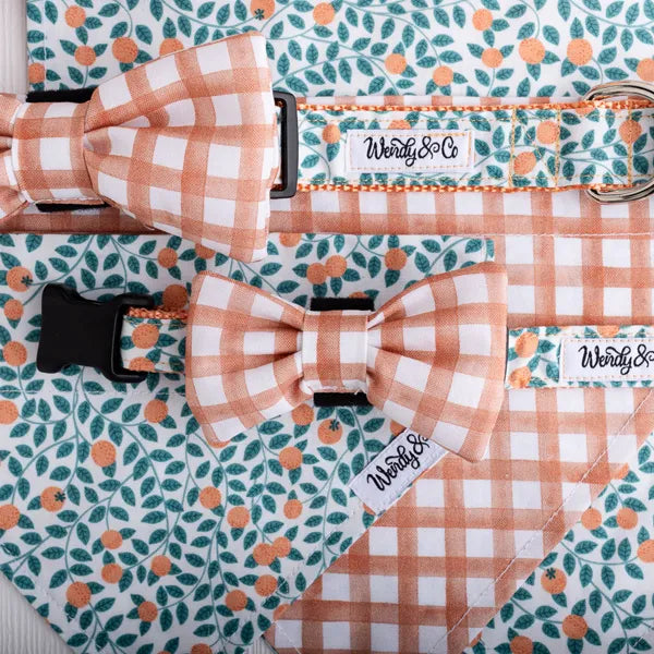 Dress your pup in harvest style with our Orchard Days dog bow tie. The peachy check adds seasonal charm, and the Velcro backing makes it easy to attach securely to any collar. Matches the Orchard Days collar, bandana, and Peach Leash for a complete look.