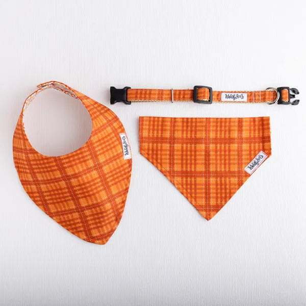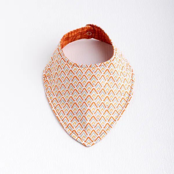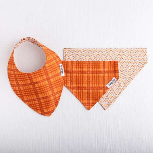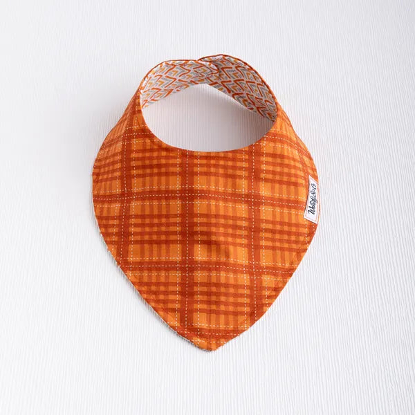 Celebrate fall mealtime with our Pumpkin Spice Plaid reversible baby bib. One side features a deep orange plaid, while the reverse shows a geometric mountain print in warm tan and orange. Handmade from soft flannel for comfort and durability, this bib keeps little ones clean while adding seasonal style. Coordinates perfectly with our Pumpkin Spice Plaid dog bandana, collar, bow tie, and mushroom leash for adorable matching family photos.