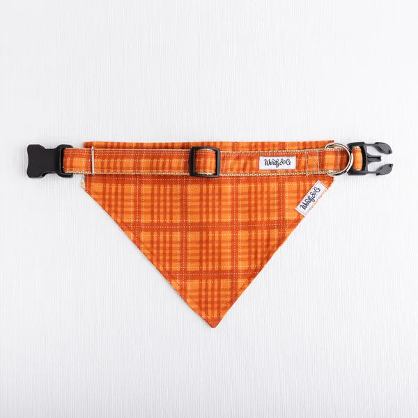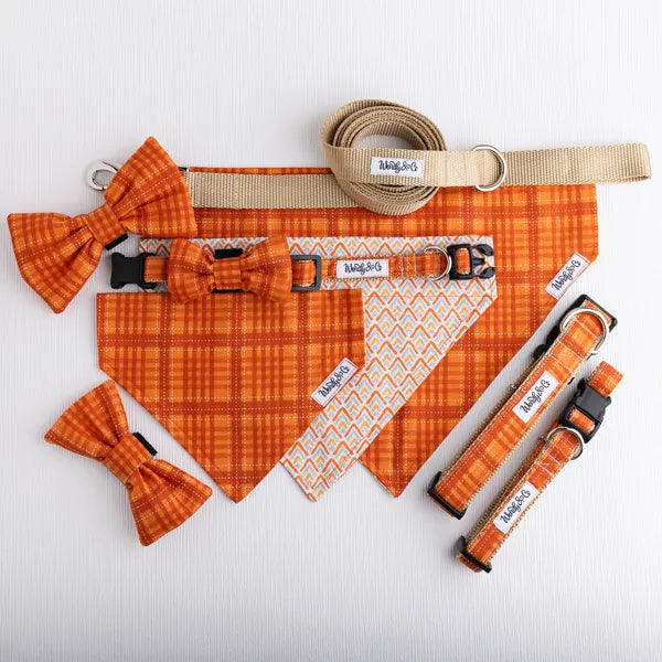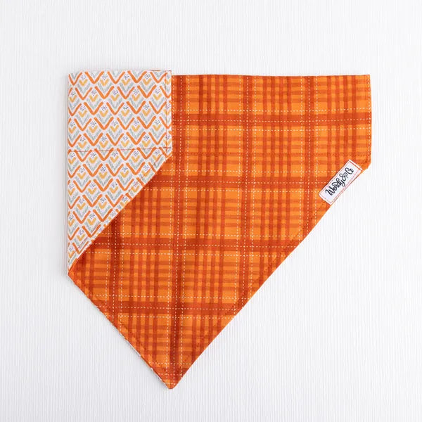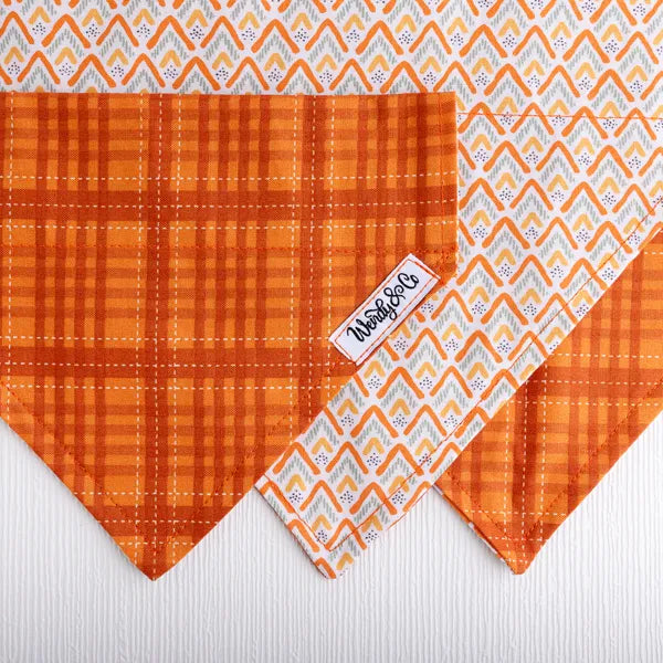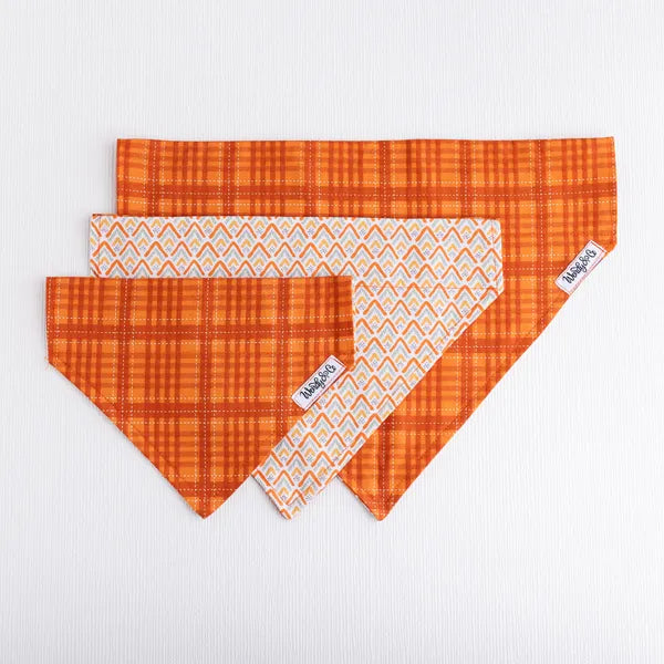 Celebrate fall in style with our Pumpkin Spice Plaid reversible dog bandana. One side features a deep orange plaid perfect for autumn walks and photos, while the reverse showcases a geometric mountain print in warm tan and orange. Designed for both style and comfort, this bandana pairs perfectly with our Pumpkin Spice Plaid collar, bow tie, and mushroom leash for a complete fall-ready look.