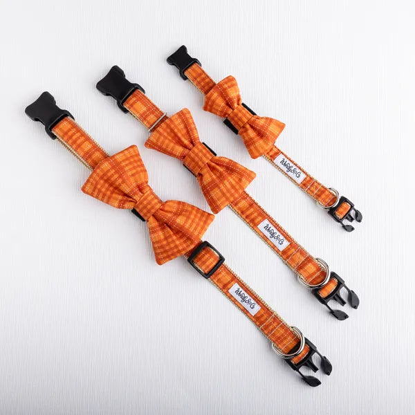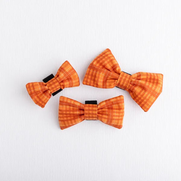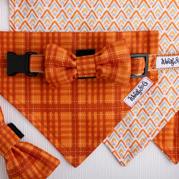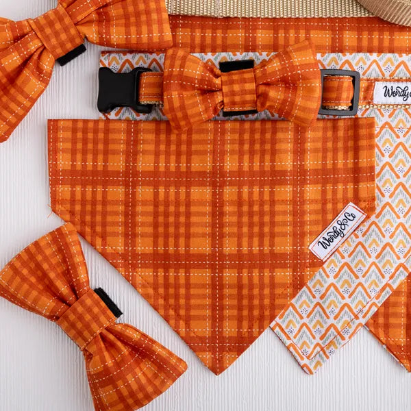 Add a touch of autumn charm with our Pumpkin Spice Plaid dog bow tie. Designed to Velcro securely over your dog’s collar, it’s easy to wear and instantly elevates any outfit. Pairs perfectly with the matching collar, reversible bandana, and mushroom leash for a full seasonal ensemble.